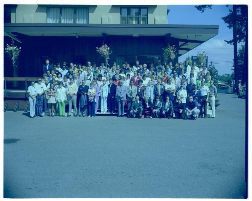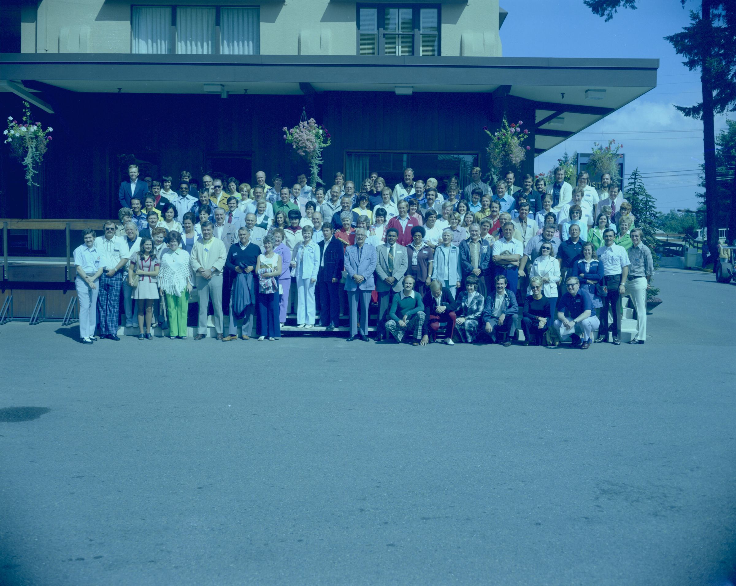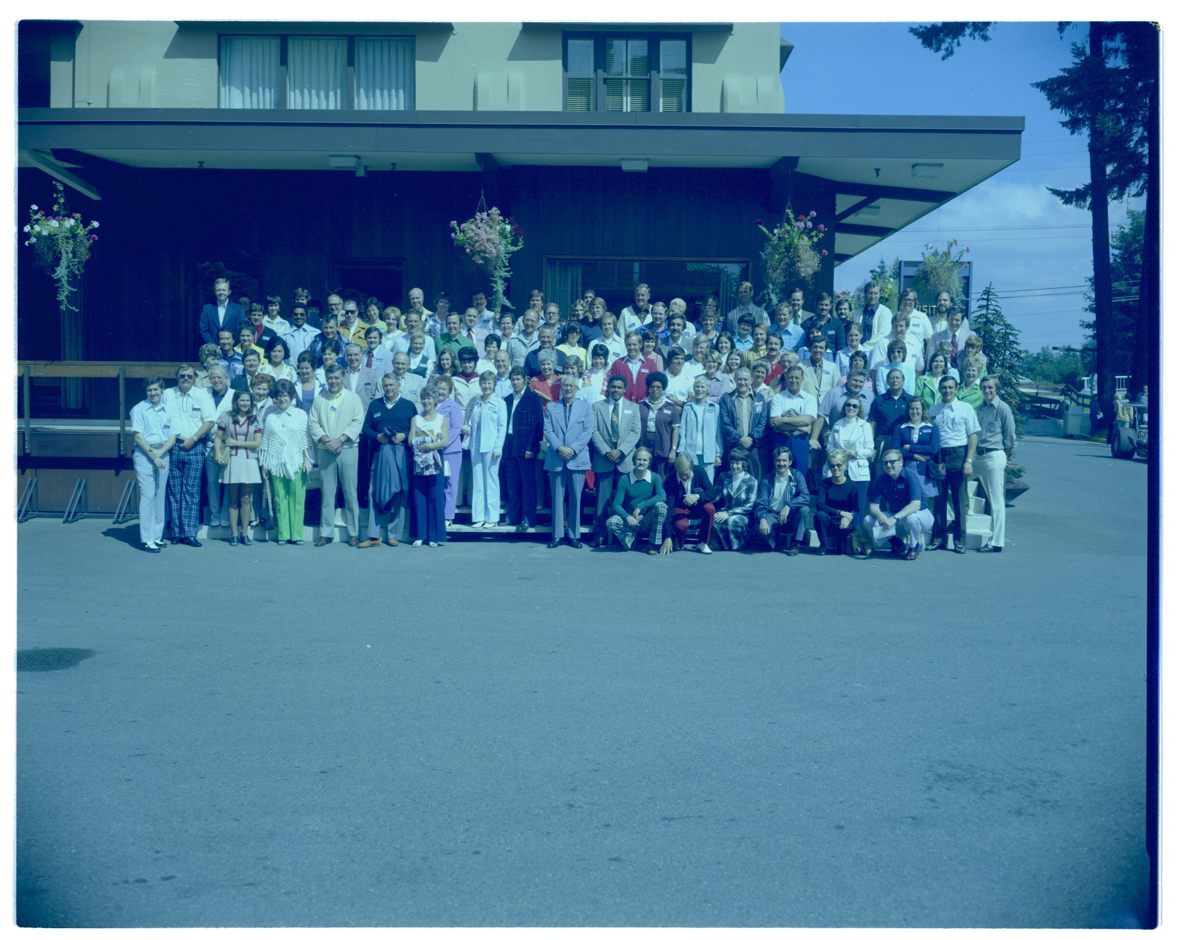 Negative, sheet film. 4 x 5 color. Olympia Brewing Company marketing conference for sales representatives. No ID on people.