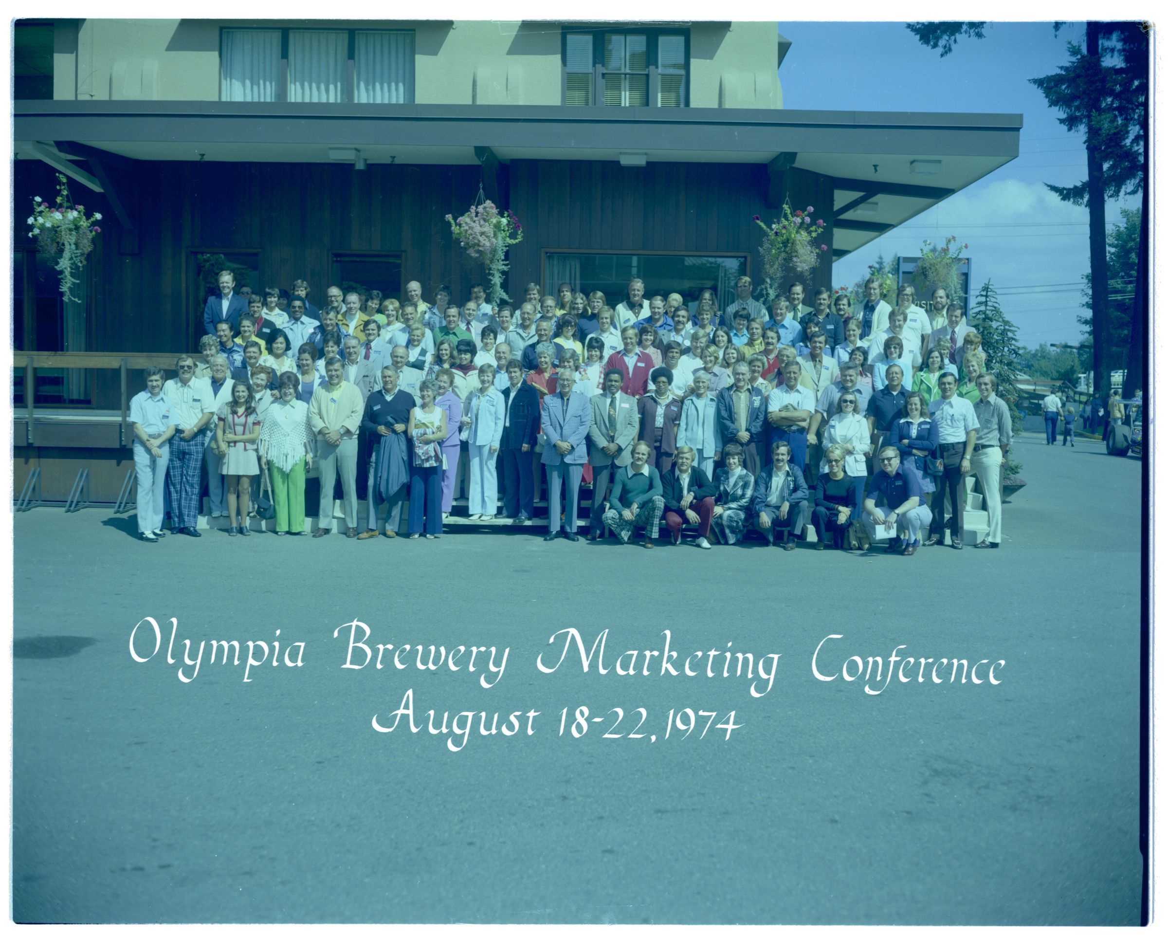 Negative, sheet film. 4 x 5 color. Olympia Brewing Company marketing conference for sales representatives. No ID on people.