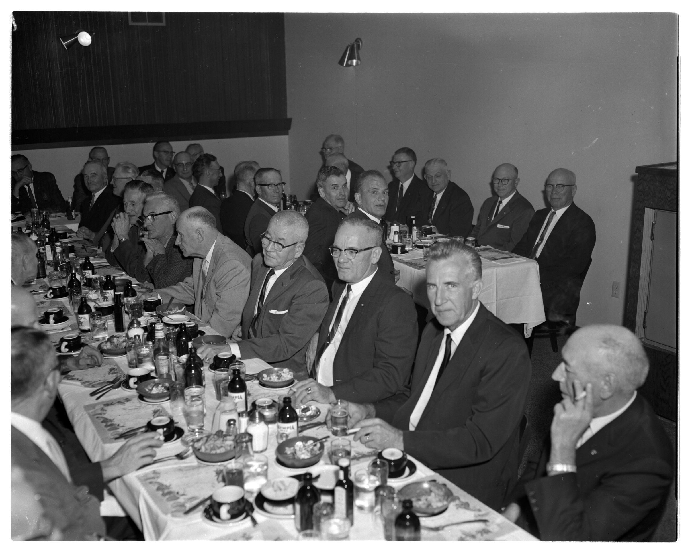 Negative, sheet film. 4 x 5 b&w. No. 4802. Olympia Brewing Company "It's the Water" Club. Members are employees with at least 20 years on the job. Wen Townsend seated 2nd from right, staring at camera. No ID on others.Name/Title