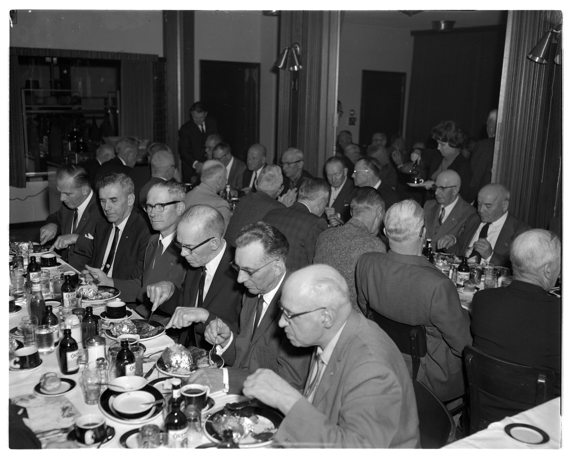 Negative, sheet film. 4 x 5 b&w. No. 4802. Olympia Brewing Company "It's the Water" Club. Members are employees with at least 20 years on the job. Ed Winkleman 2nd from left. Dave Clinton 3rd from left. No ID on others.Name/Title