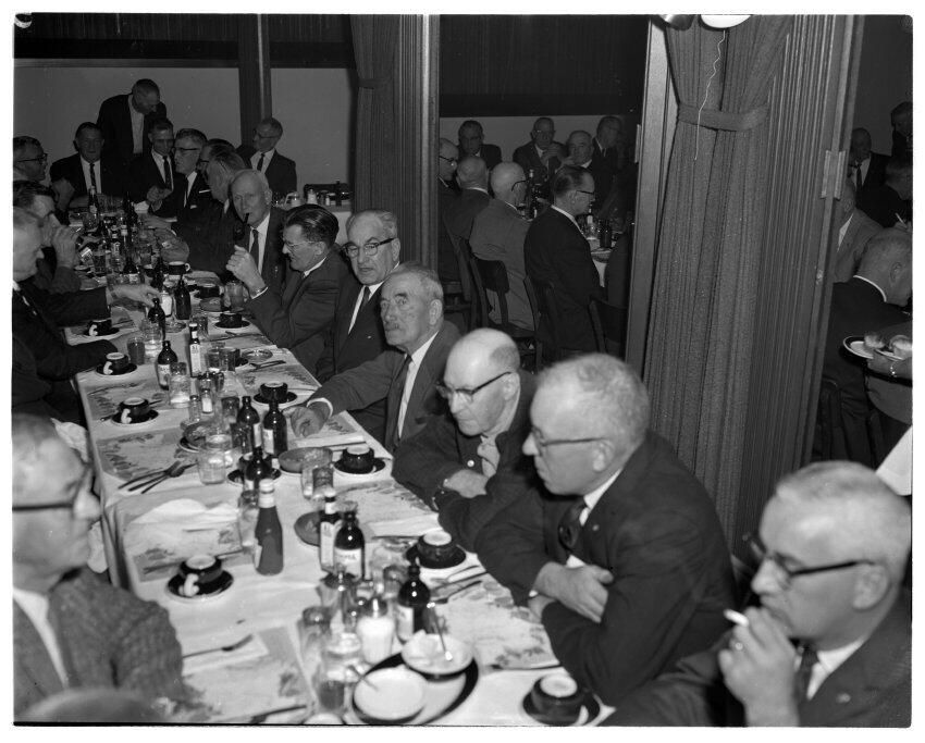 Negative, sheet film. 4 x 5 b&w. No. 4802. Olympia Brewing Company "It's the Water" Club. Members are employees with at least 20 years on the job. Don Winner is sixth from right, holding hand up in air. No ID on others.Name/Title