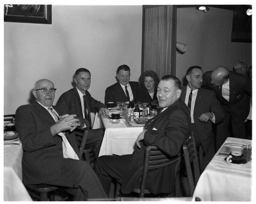 Negative, sheet film. 4 x 5 b&w. No. 4802. Olympia Brewing Company "It's the Water" Club. Members are employees with at least 20 years on the job. Clockwise from left: unknown; Lee Gamer; unknown; unknown; Bink Schmidt; Carl Westmoreland leaning over; Harold Rohrbeck.Name/Title