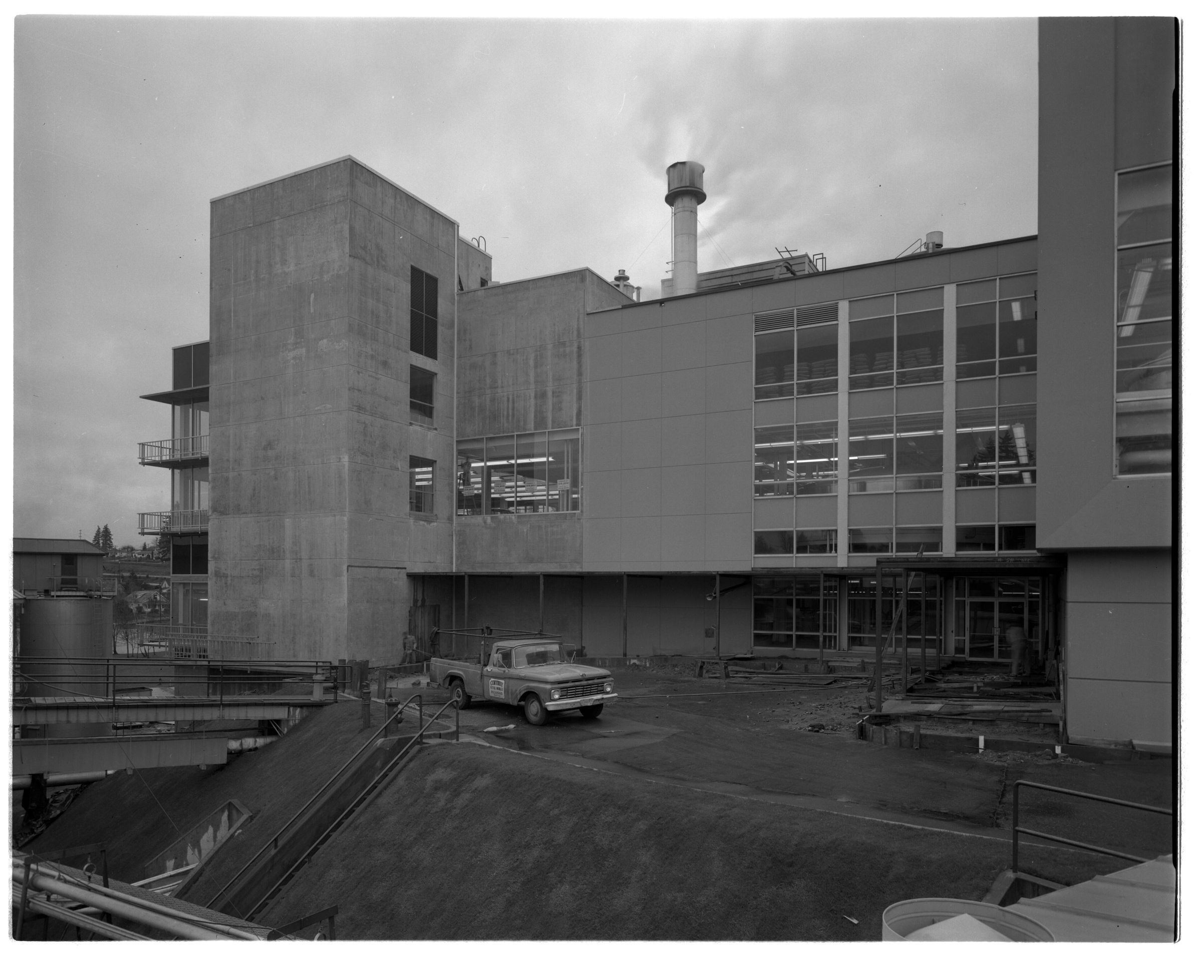 Negative, sheet film. 4 x 5 b&w. No. 6716. Olympia Brewery. B brewhouse, C brewhouse at far left. Paul Knight, brewmaster, had his office at far right.