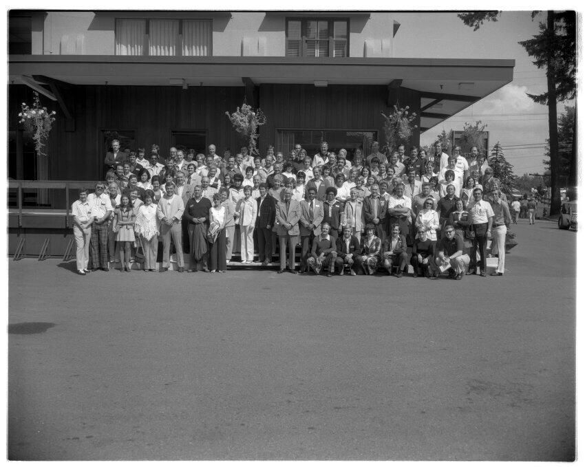 Negative, sheet film. 4 x 5 color. Olympia Brewing Company marketing conference for sales representatives. No ID on people.
