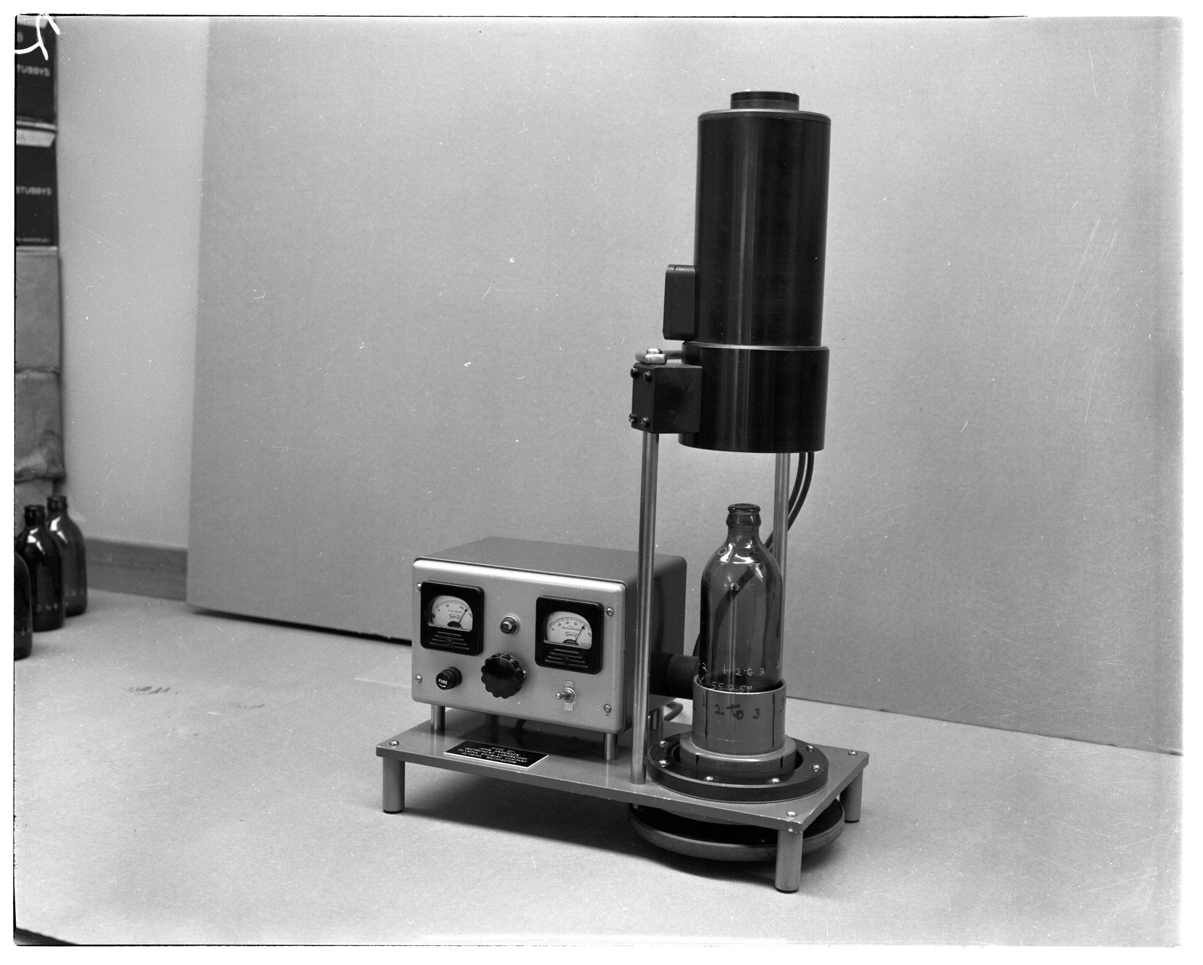 Negative, sheet film. 4 x 5 b&w. No. 4285. Olympia Brewing Company. Instrument used to measure the opacity of glass bottles. First model developed by OBC product control manager Wayne Sanders. Instrument shown here was built by OBC employee John Anderson. See article in May 1963 "It's the Water News." Base of unit (missing the line volt meter box on left) is in the Schmidt House archives. Photo ordered by Lee Gamer. Retouched 09/20/1963.Name/Title