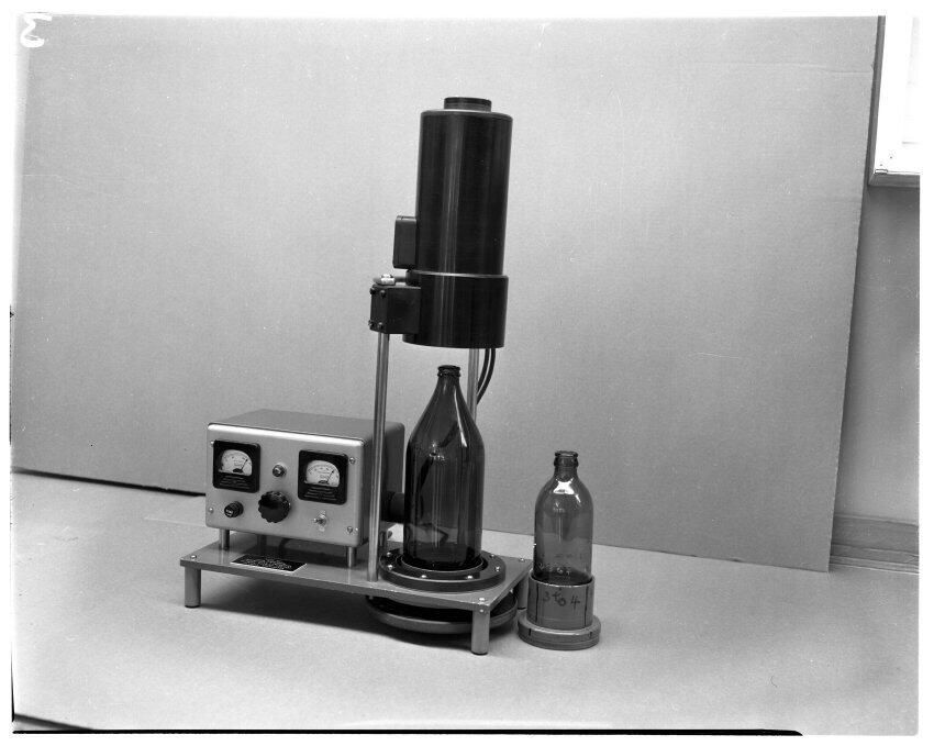 Negative, sheet film. 4 x 5 b&w. No. 4285. Olympia Brewing Company. Instrument used to measure the opacity of glass bottles. First model developed by OBC product control manager Wayne Sanders. Instrument shown here was built by OBC employee John Anderson. See article in May 1963 "It's the Water News." Base of unit (missing the line volt meter box on left) is in the Schmidt House archives. Photo ordered by Lee Gamer. Retouched 09/20/1963.Name/Title