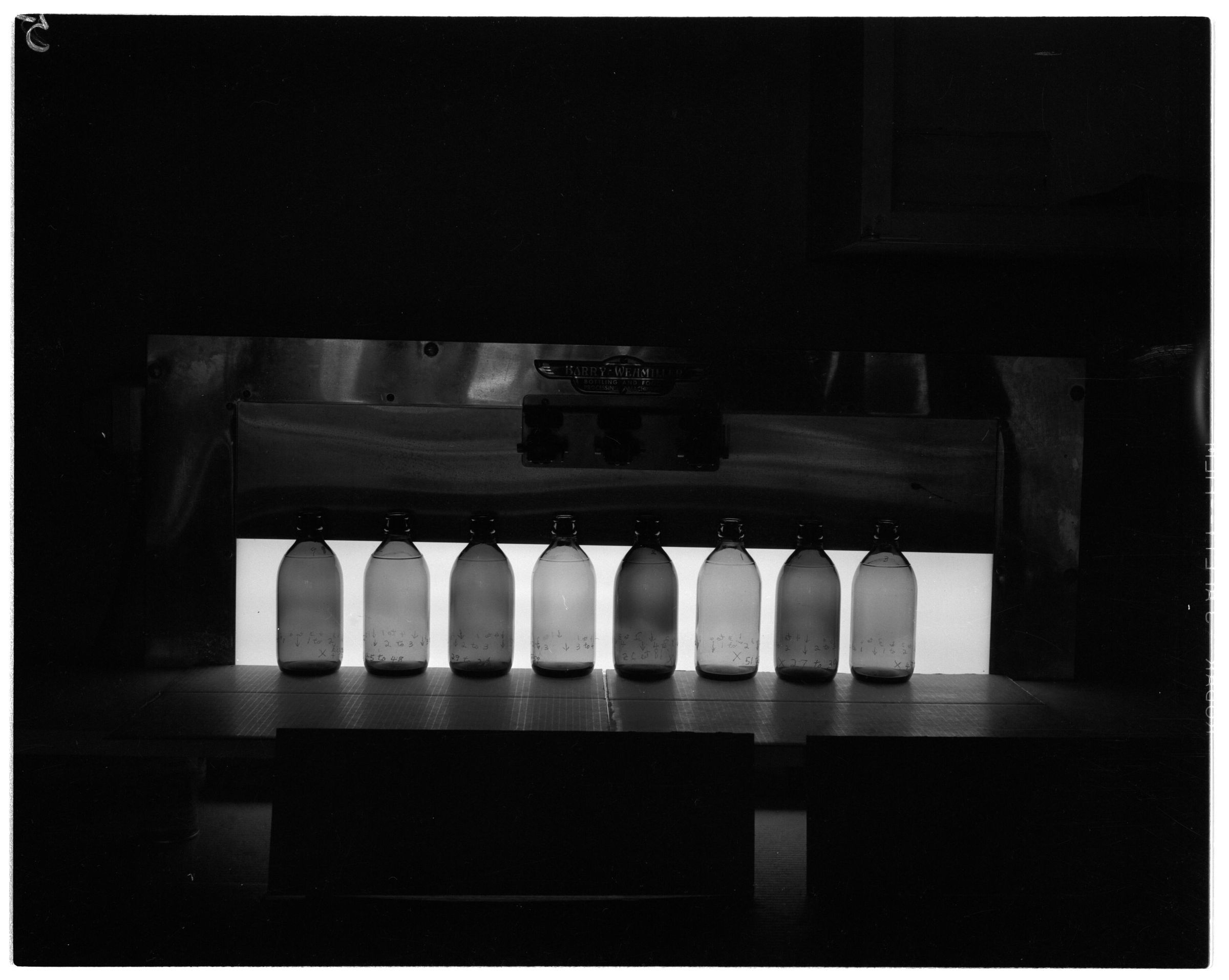 Negative, sheet film. 4 x 5 b&w. No. 4285. Oly Brewing Co. Bottles in lab. Possibly checking for opacity of bottles. Ordered by Lee Gamer. Retouched 09/20/1963.
