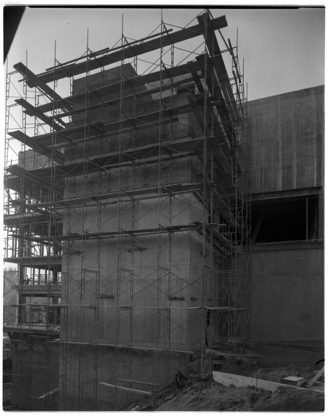 Negative, sheet film. 5 x 4 b&w. No. 6716. Olympia Brewery. C brewhouse under construction. Elevator shaft and stairway shown.