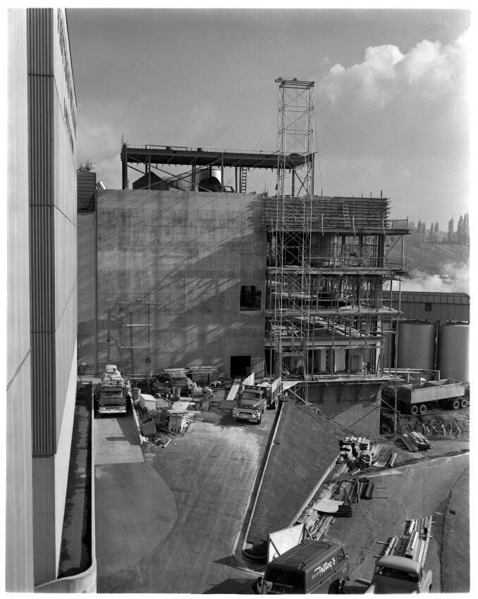 Negative, sheet film. 5 x 4 b&w. No. 6716. Olympia Brewery. C brewhouse under construction. Photograph was standing on top of M cellar.