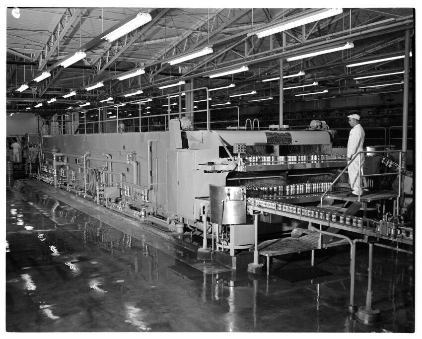 Negative, sheet film. 4 x 5 b&w. No. 3147. Olympia Brewing Company can line. End feed of pasteurizer. Order finished 01/16/1961.