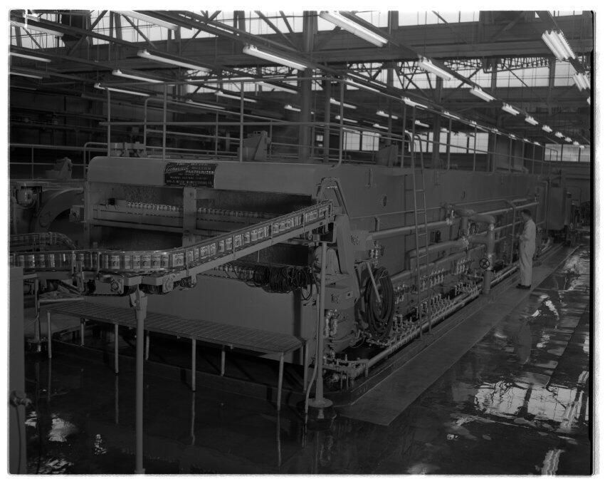 Negative, sheet film. 4 x 5 b&w. No. 3147. Olympia Brewing Company can line. Outfeed from pasteurizer. Order finished 01/16/1961.