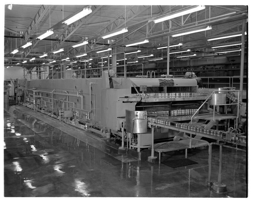 Negative, sheet film. 4 x 5 b&w. No. 3147. Olympia Brewing Company can line. Pasteurizer. Order finished 01/16/1961.