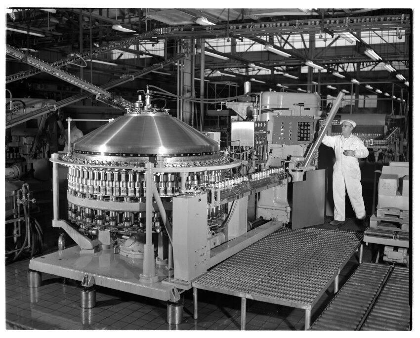 Negative, sheet film. 4 x 5 b&w. No. 3147. Olympia Brewing Company can line. Lids being installed on full cans. Machine filled 1,200 cans/minute. Order finished 01/16/1961.