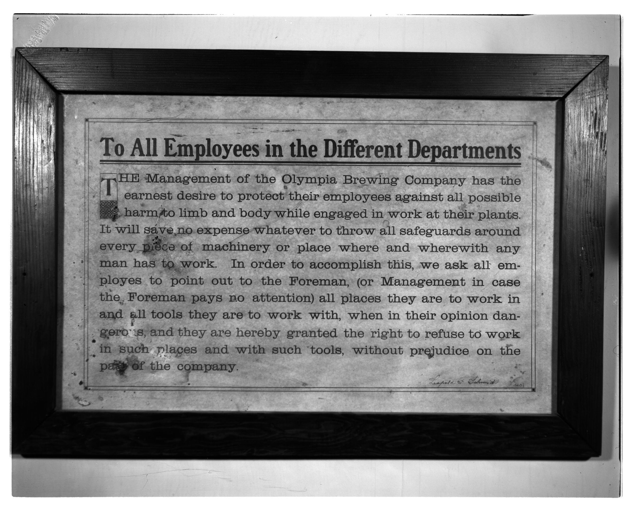 Negative, sheet film. 4 x 5 b&w. No. 3146. Olympia Brewery Company statement from Leopold F. Schmidt to employees regarding safety in workplace.