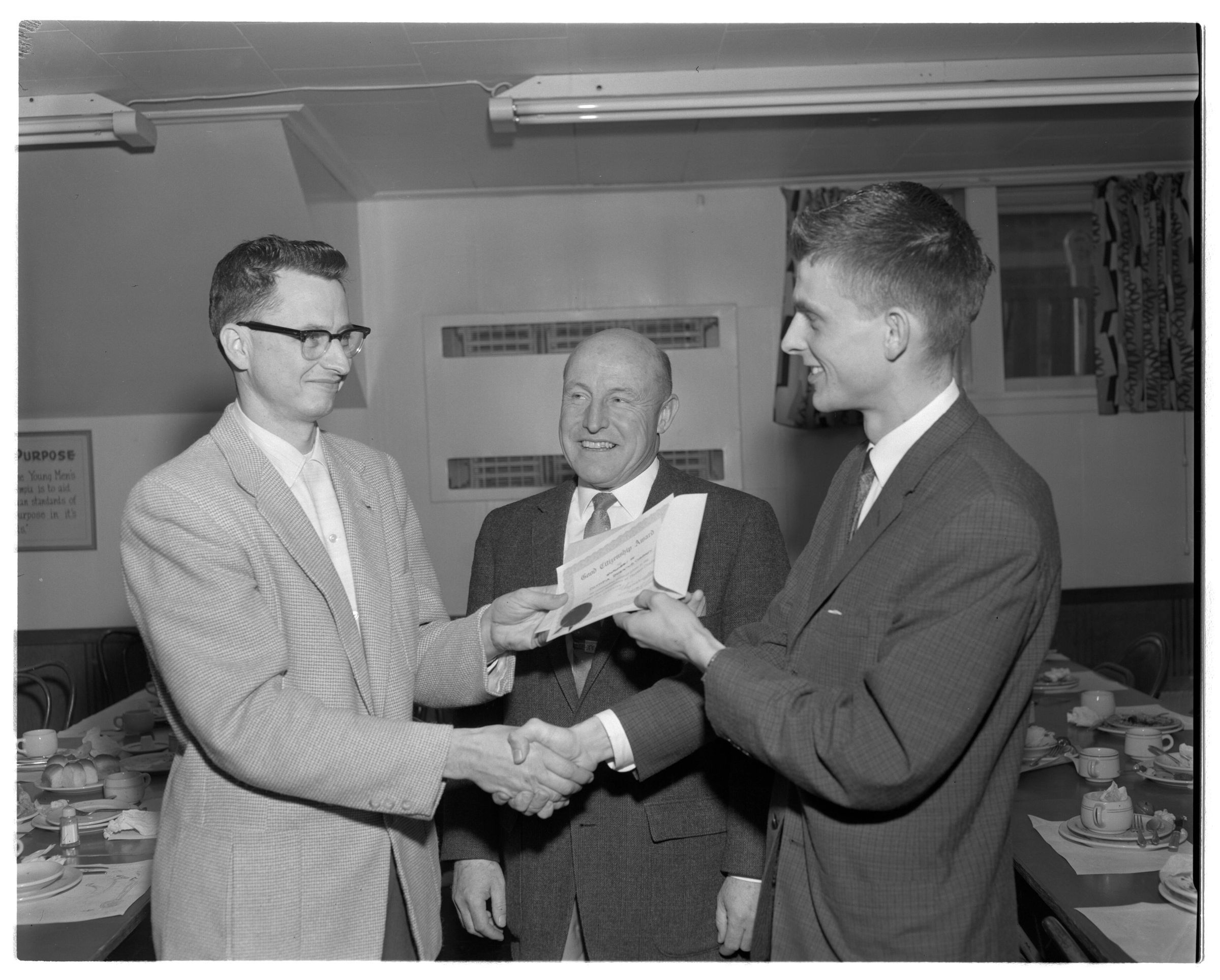 Negative, sheet film. 4 x 5 b&w. No. 3146. Ordered by U.G.N. Olympia Brew Company presentation. Carl Westmoreland in center. No ID on others. Retouched 12/09/1963.