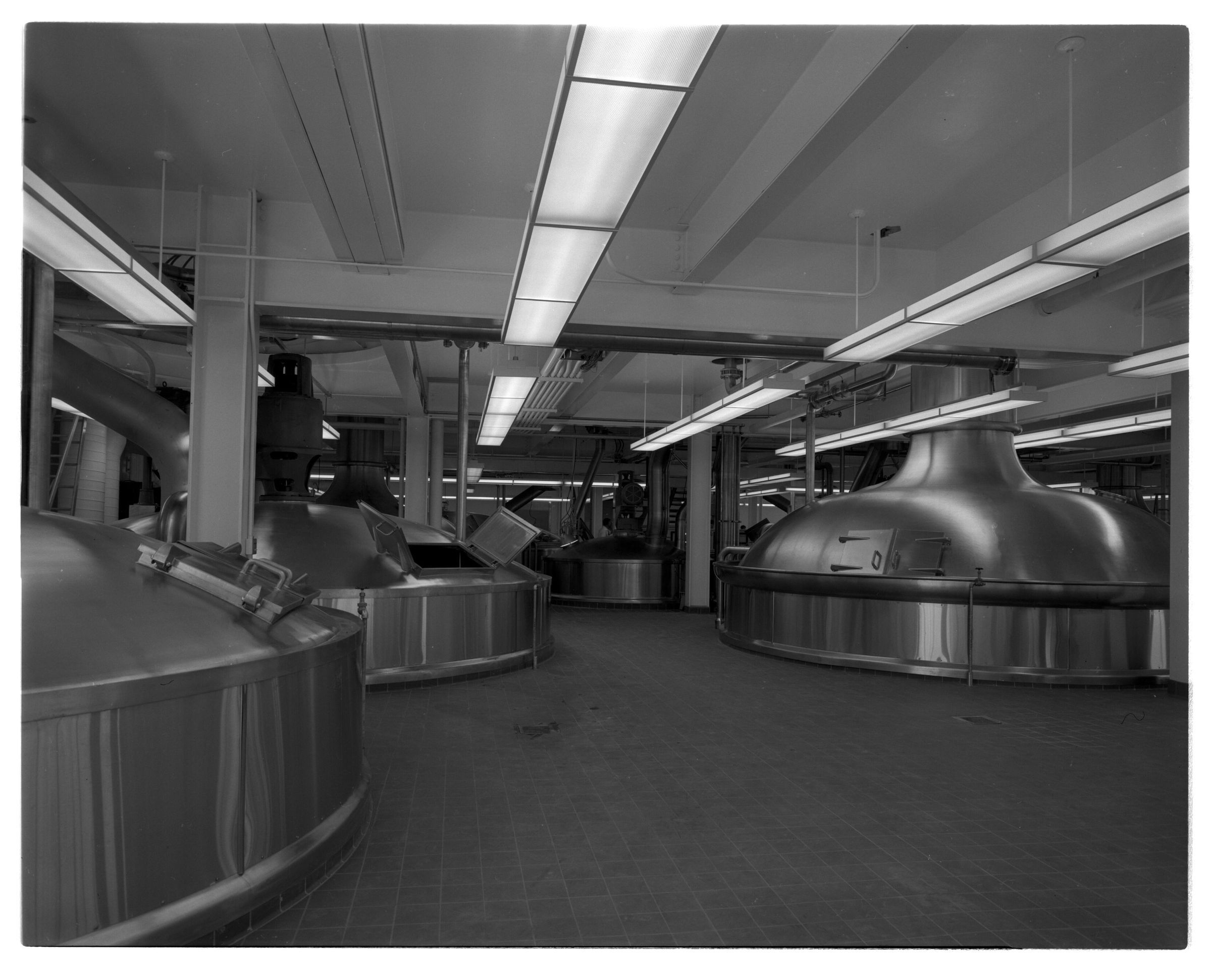 Negative, sheet film. 4 x 5 b&w. No. 6716. Oly Brewing Co. for PSF Indenture. C brewhouse. Vessels from left: cereal cooker, mash tub, brewkettle. Vessel in far background is actually in B brewhouse.Name/Title