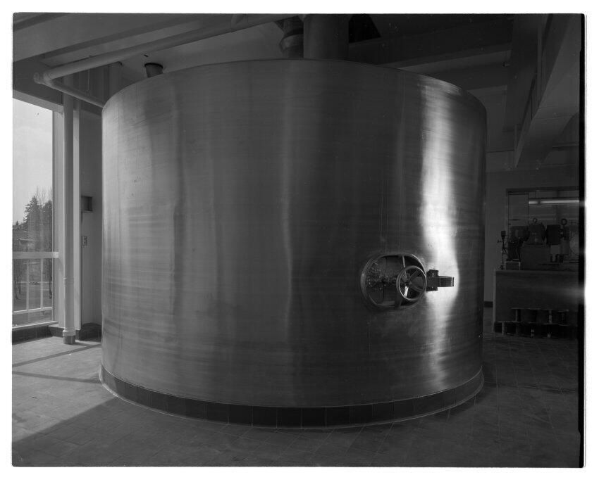 Negative, sheet film. 4 x 5 b&w. No. 6716. Oly Brewing Co. for PSF Indenture. Spent grain holding tank under lauter tub in C brewhouse.
