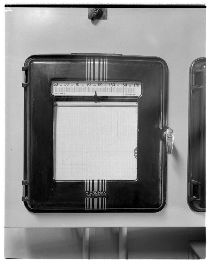 Negative, sheet film. 4 x 5 b&w. No. 3076. Olympia Brew Co. Ordered 11/18/1960. Equipment monitoring pasteurizer temperatures.