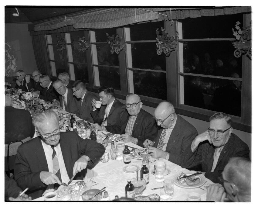 From left on far side of table: Bud Pratt, Paul Childers, George Hannon, Doc Tabor, Art Anderson, Aub Wells, Don Winner, Dix Batchellor, Bill Johnson, Frederick Schmidt. At left in foreground: Roy Hall. Dinner held at Oregon Trail Inn.Name/Title