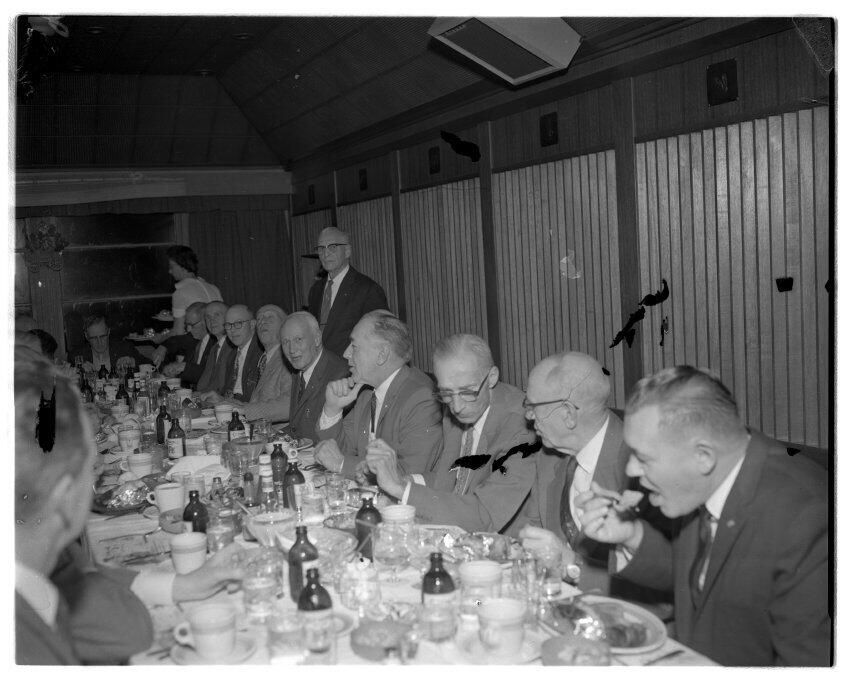 Negative, sheet film. 4 x 5 b&w. No. 3076. Olympia Brewing Company. Ordered 11/18/1960. Banquet for employees with at least 20 years on job. No ID on people. Harold Rohrbeck at far right.