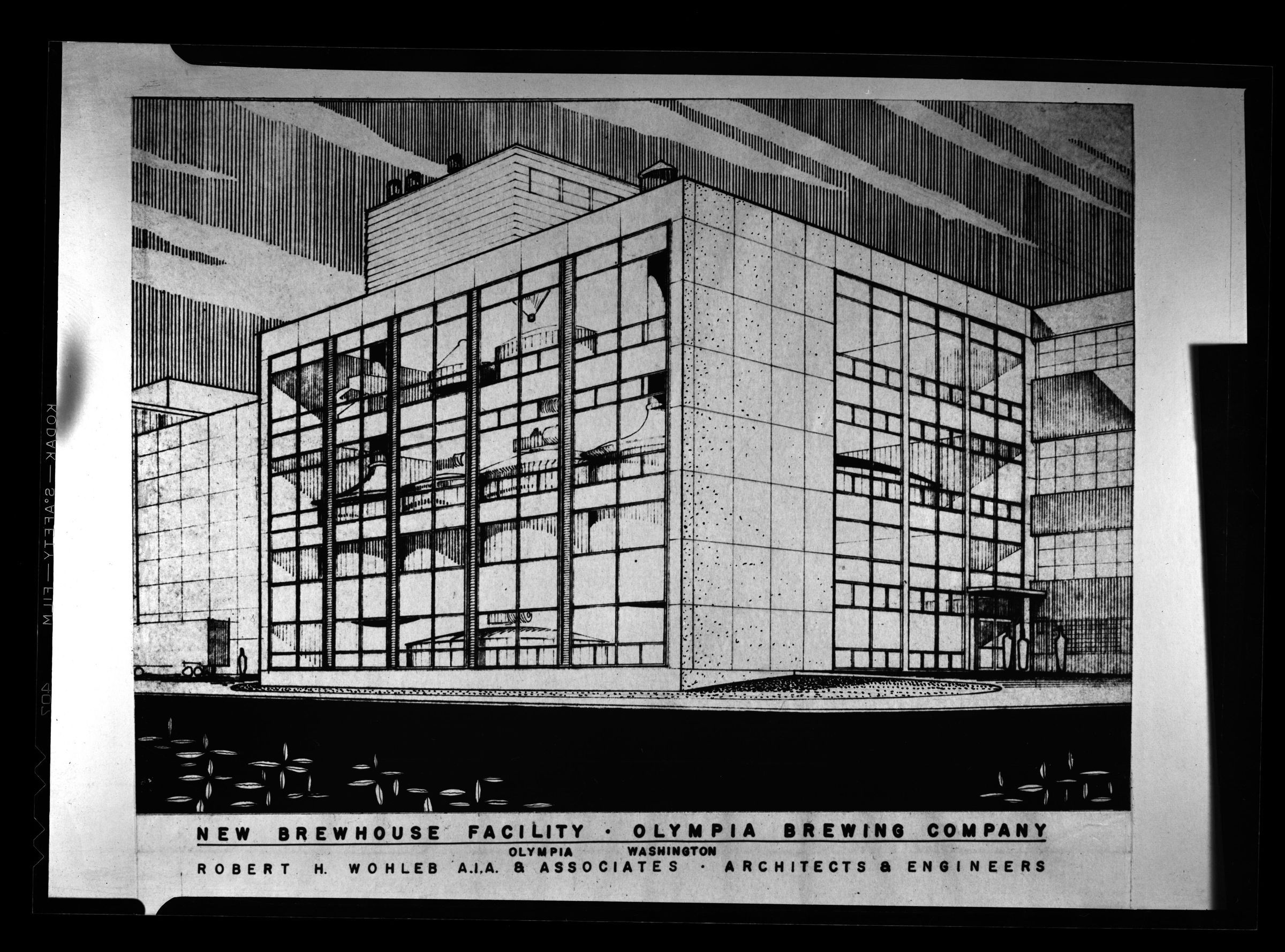 Negative, sheet film. 5 x 7 b&w. Sketch of new C brewhouse facility, Olympia Brewing Company. Robert H Wohleb A.I.A. & Associates, Architects & Engineers.