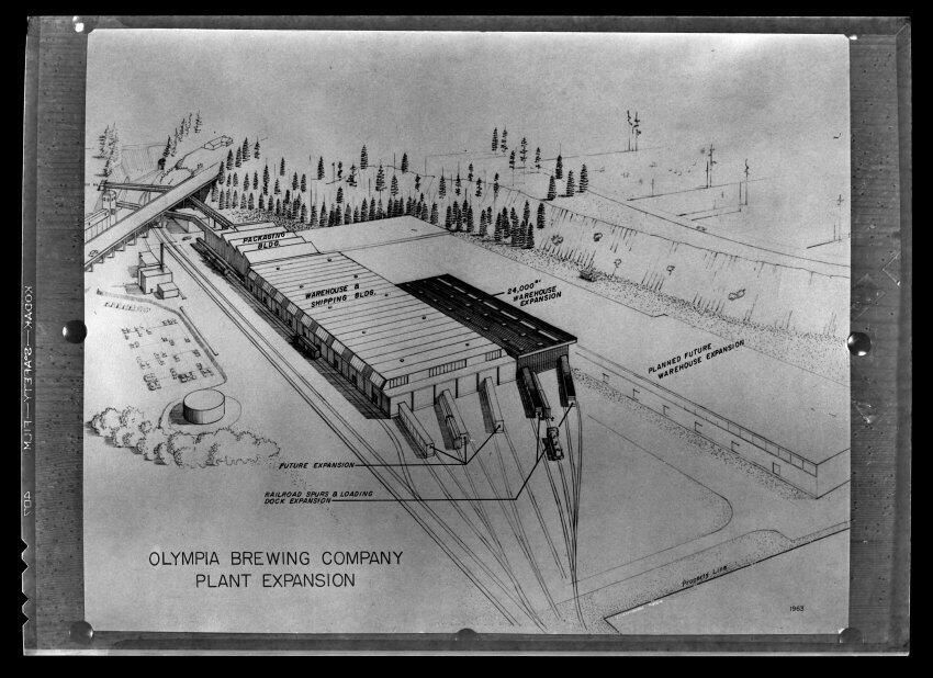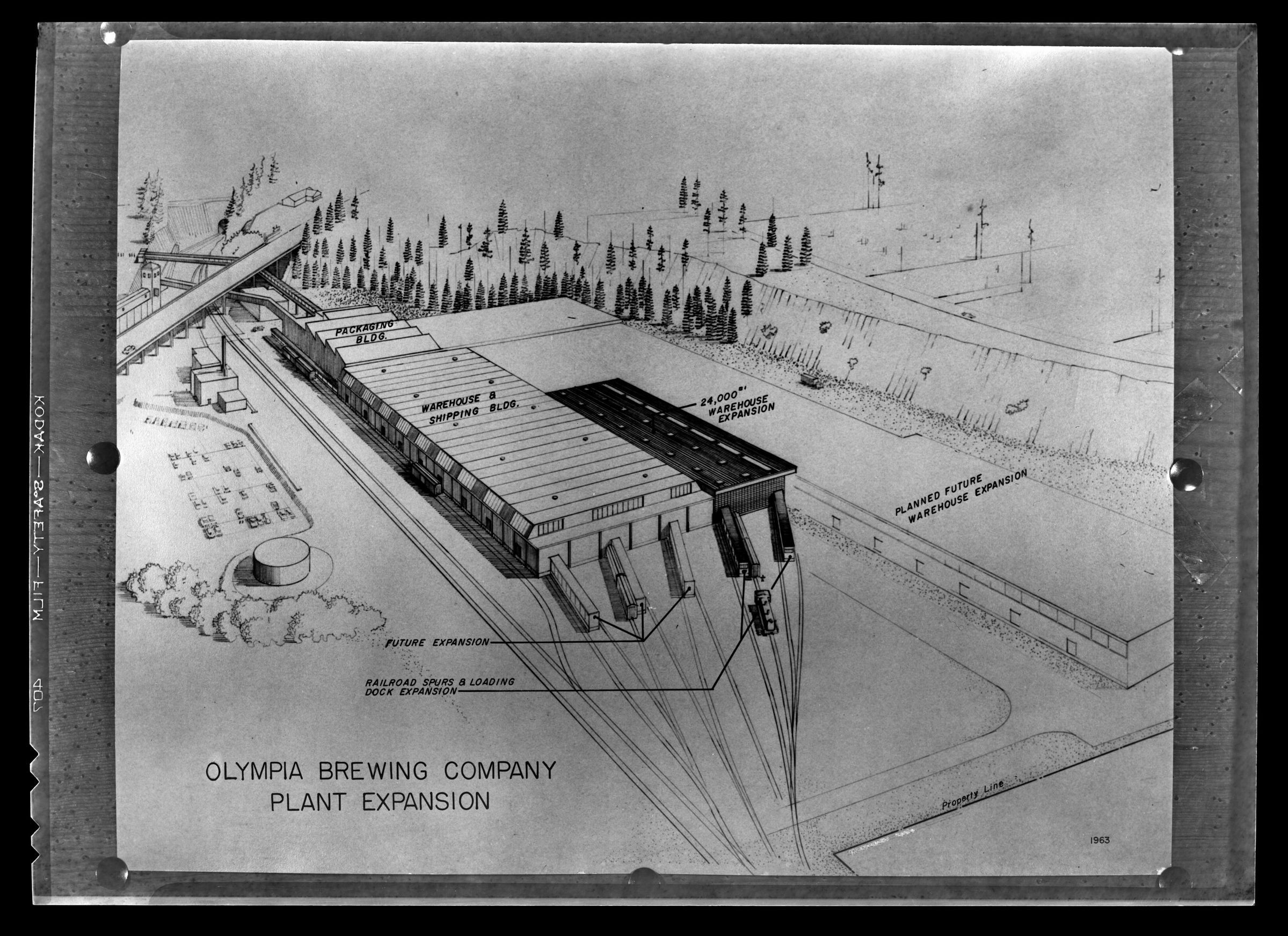 Negative, sheet film. 5 x 7 b&w. Olympia Brewing Company plant expansion, bottlehouse and warehouse in valley. Copy of sketch. Preliminary sketch only; final building was not quite this design.
