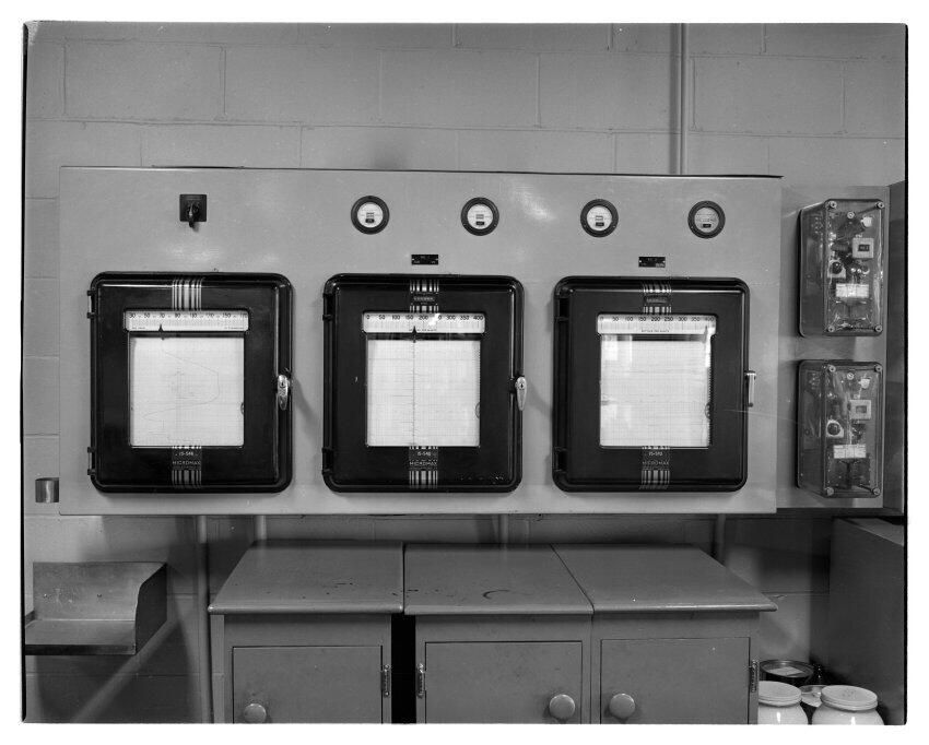 Negative, sheet film. 4 x 5 b&w. No. 2897. Olympia brewery. Ordered 06/06/1960 by Skip Schmidt. Photos of gauges, charts, and office equipment for lantern slides.