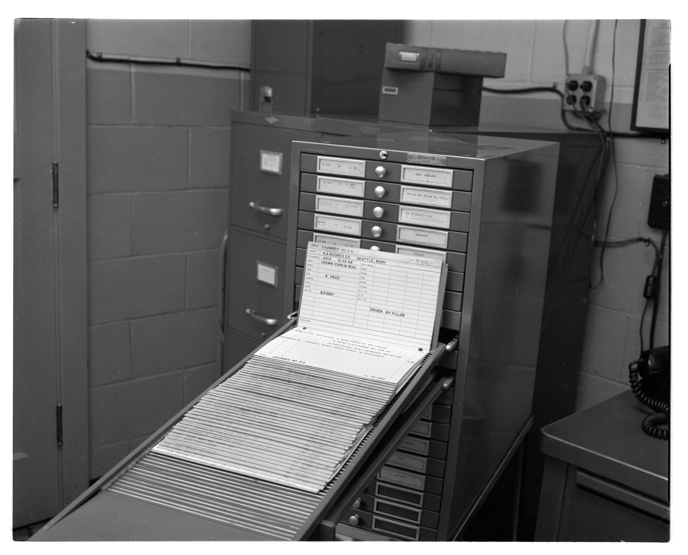 Negative, sheet film. 4 x 5 b&w. No. 2897. Olympia brewery. Ordered 06/06/1960 by Skip Schmidt. Photos of gauges, charts, and office equipment for lantern slides.