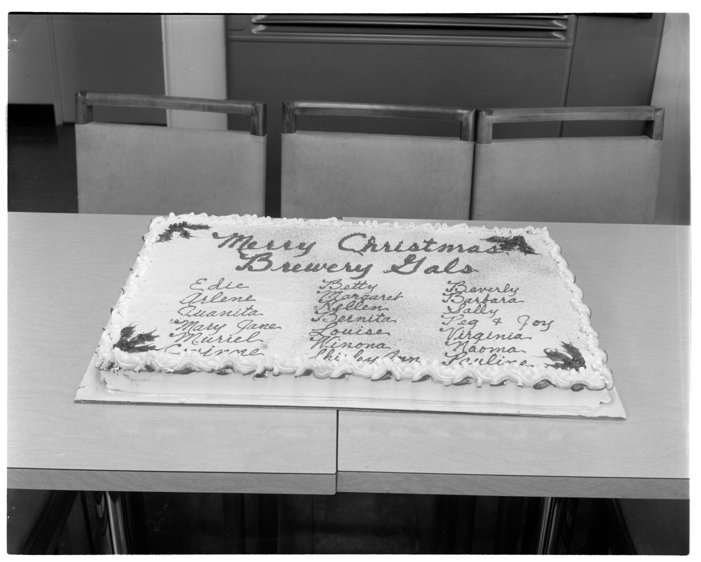 Negative, sheet film. 4 x 5 b&w. Roy Hotop (office manager) presented a Christmas cake to "brewery gals" who worked at brewery. Names include: Edie (Bryn), Arlene, Juanita, Mary Jane, Muriel, Corinne, Betty, Margaret, Helen, Bonita, Louise, Winona, Shirley Ann, Beverly, Barbara, Sally, Peg, Joy, Virginia, Naoma, and Pauline.Name/Title