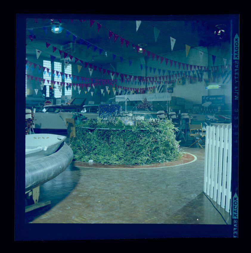Negative, sheet film. 3 x 3 color. A-25. No. 11. Olympia brewery fountain display inside Olympia Armory. The Olympia Salmon Club organized its second annual Boat & Sportsmen Show at the armory; the show was held February 28, March 1 and 2, and featured displays by many local businesses.Name/Title