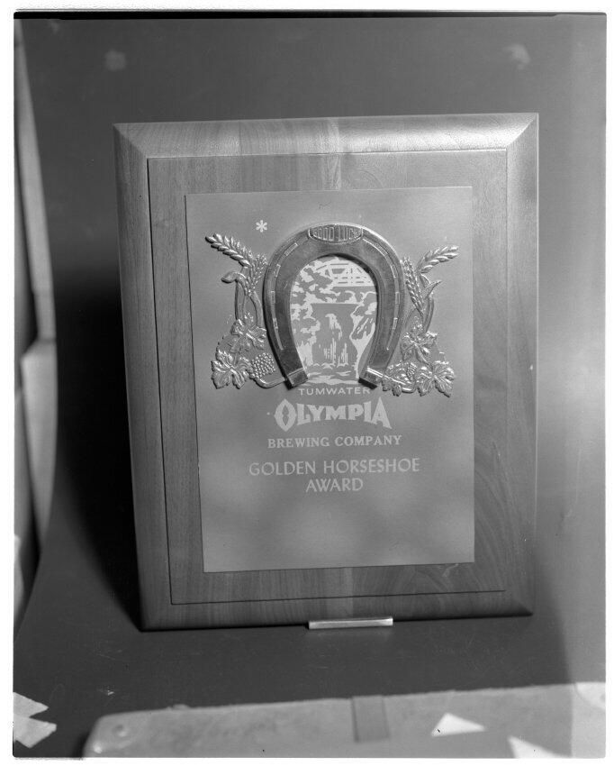 Negative, sheet film. 5 x 4 b&w. Olympia Brewing Company Golden Horseshoe Award. Given to distributors.