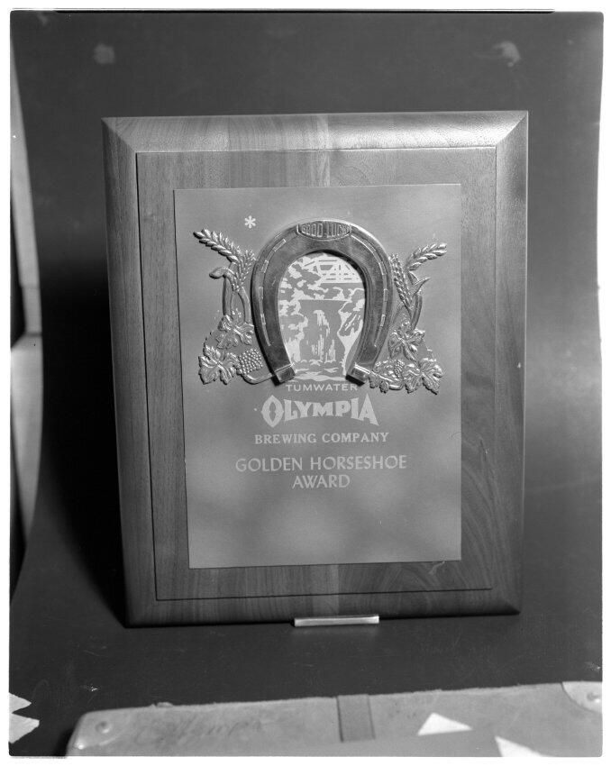 Negative, sheet film. 5 x 4 b&w. Olympia Brewing Company Golden Horseshoe Award. Given to distributors.