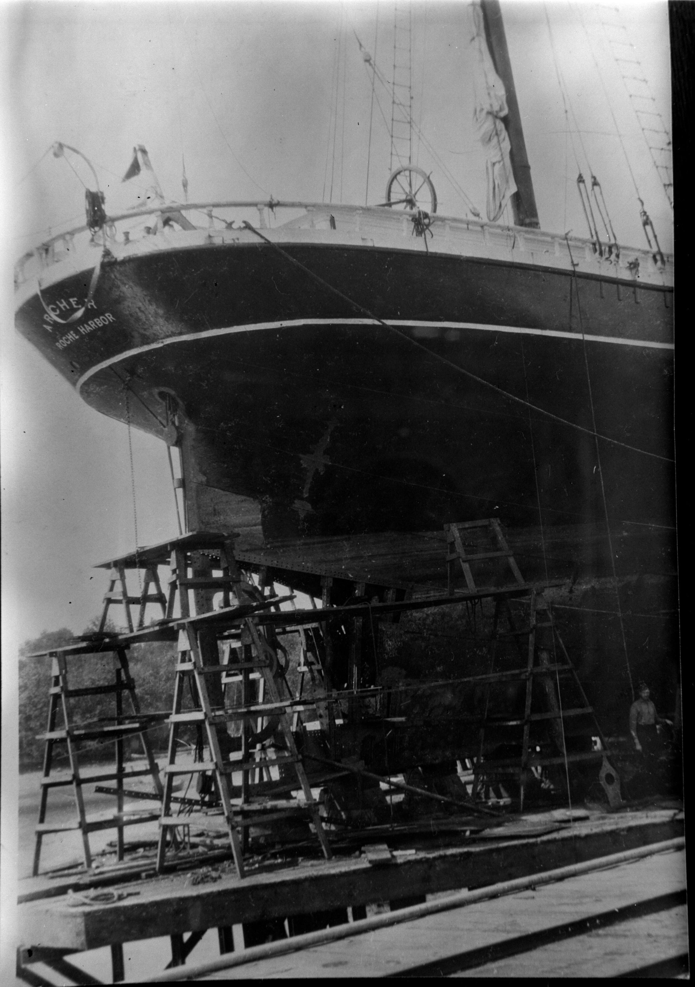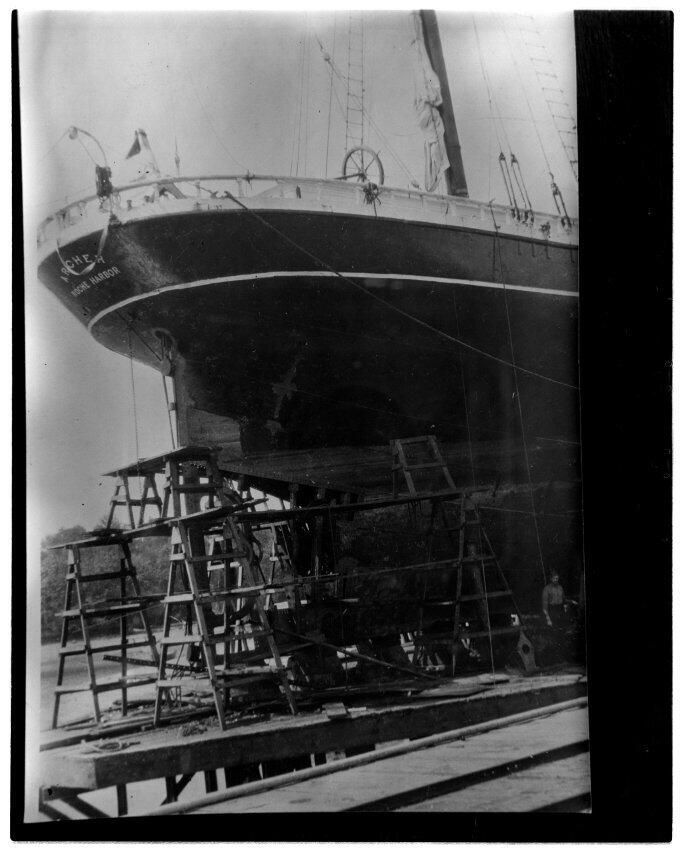 Negative, sheet film. 5 x 4 b&w. Stern of sailing ship Archer. This ship was converted to gas power by Peter G. Schmidt and Gas Power Company.Other Names and Numbers