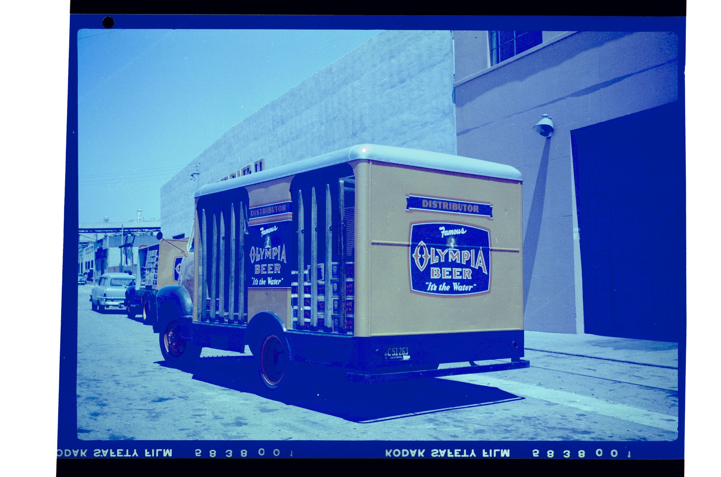 Negative, sheet film. 3 x 4 color. Distributor's beer trucks. California.