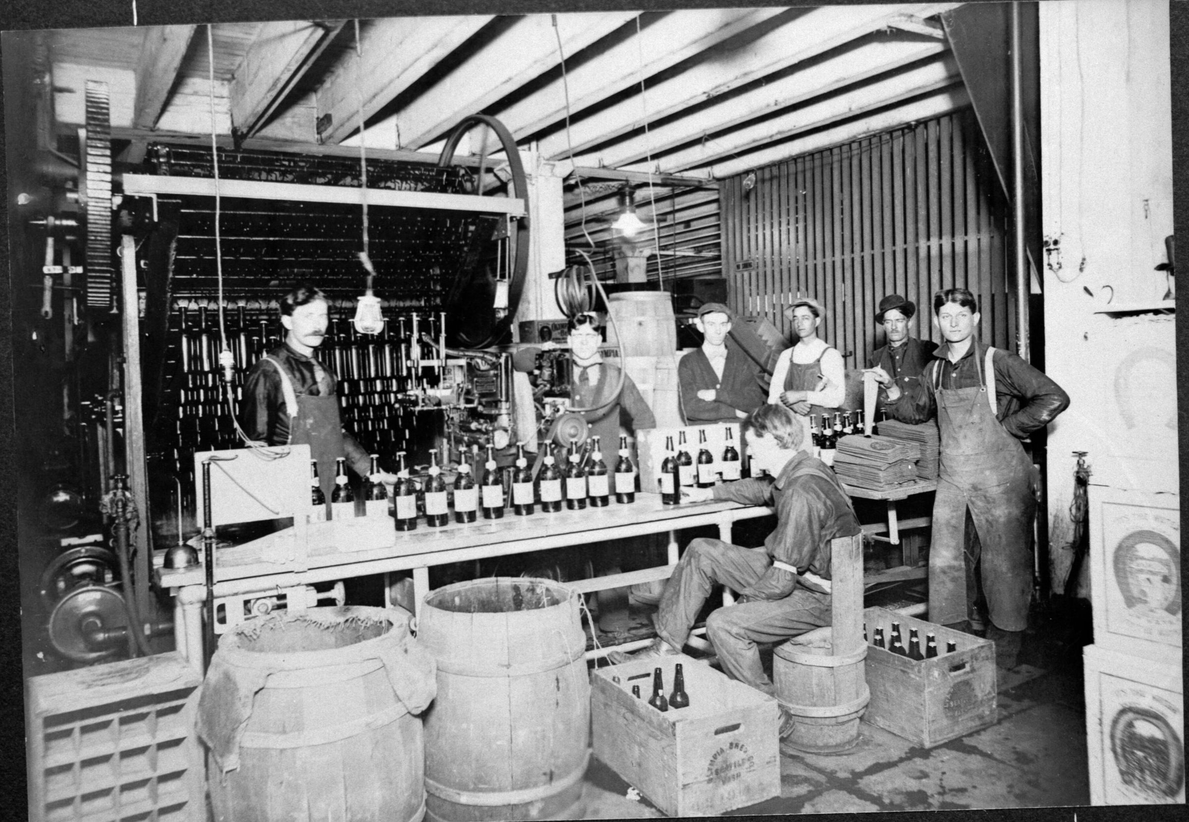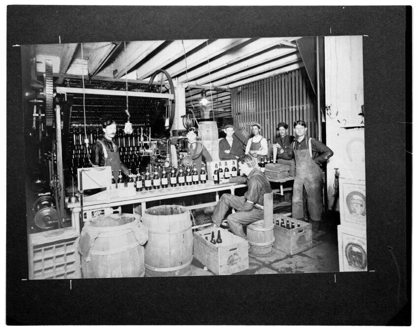 Negative, sheet film. 4 x 5 b&w. Scene in Olympia Beer bottling house in Seattle. Shipping crates marked Seattle. Barrels in left foreground are shipping barrels. Men are packing filled bottles of beer for shipment. No ID on men.Other Names and Numbers