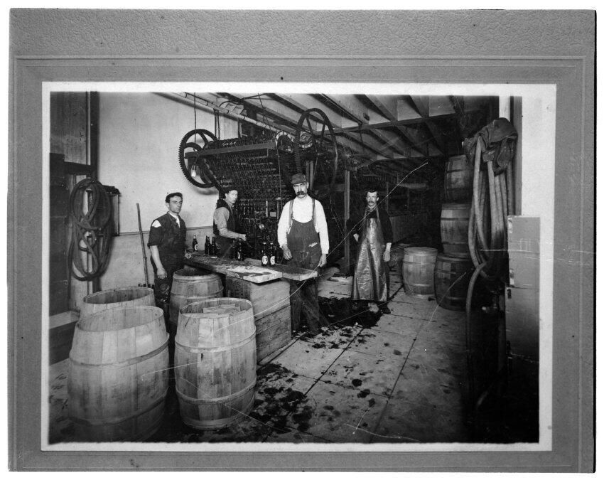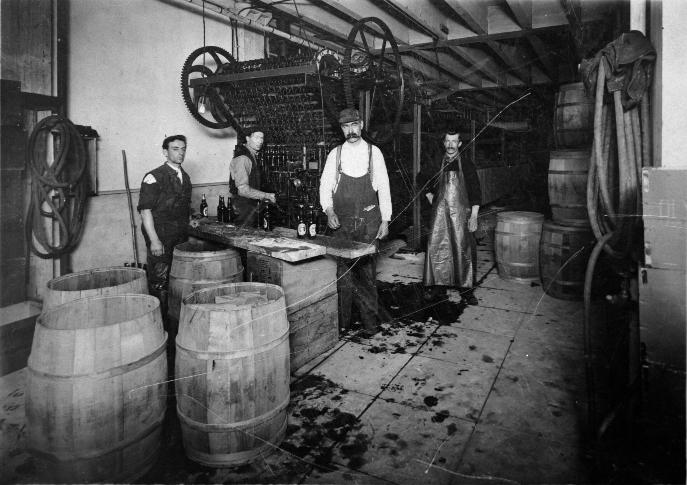 Negative, sheet film. 4 x 5 b&w. Olympia brewery workers are seen packing beer bottles into wooden barrels for shipment. This could have been at Tumwater brewery or at Seattle shipping plant. No ID on men.Other Names and Numbers