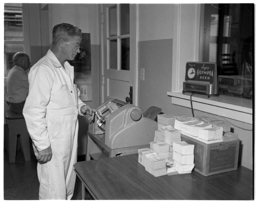Negative, sheet film. 4 x 5 b&w. Employee dating tax stamps.