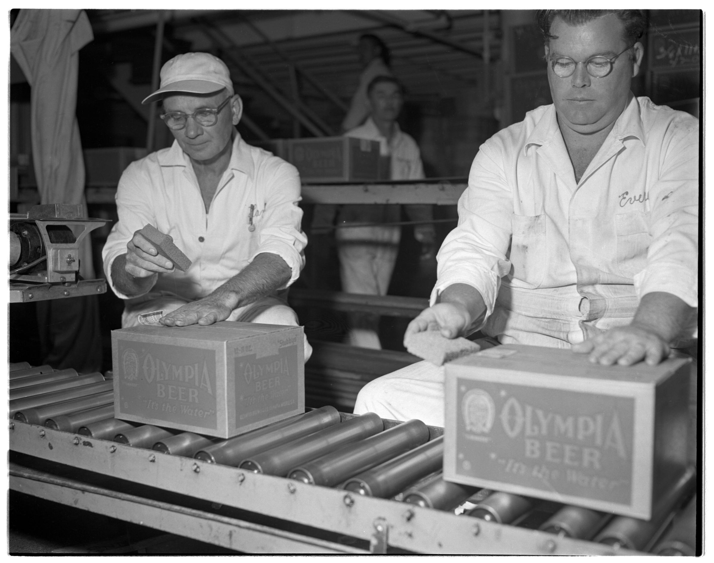 Negative, sheet film. 4 x 5 b&w. Employees applying tax stamps to filled Oly cartons.