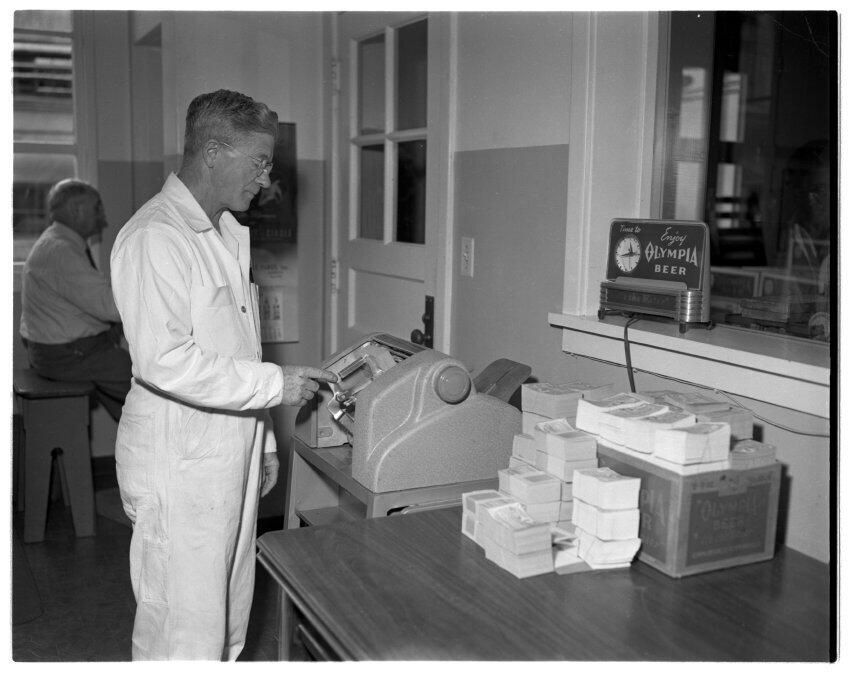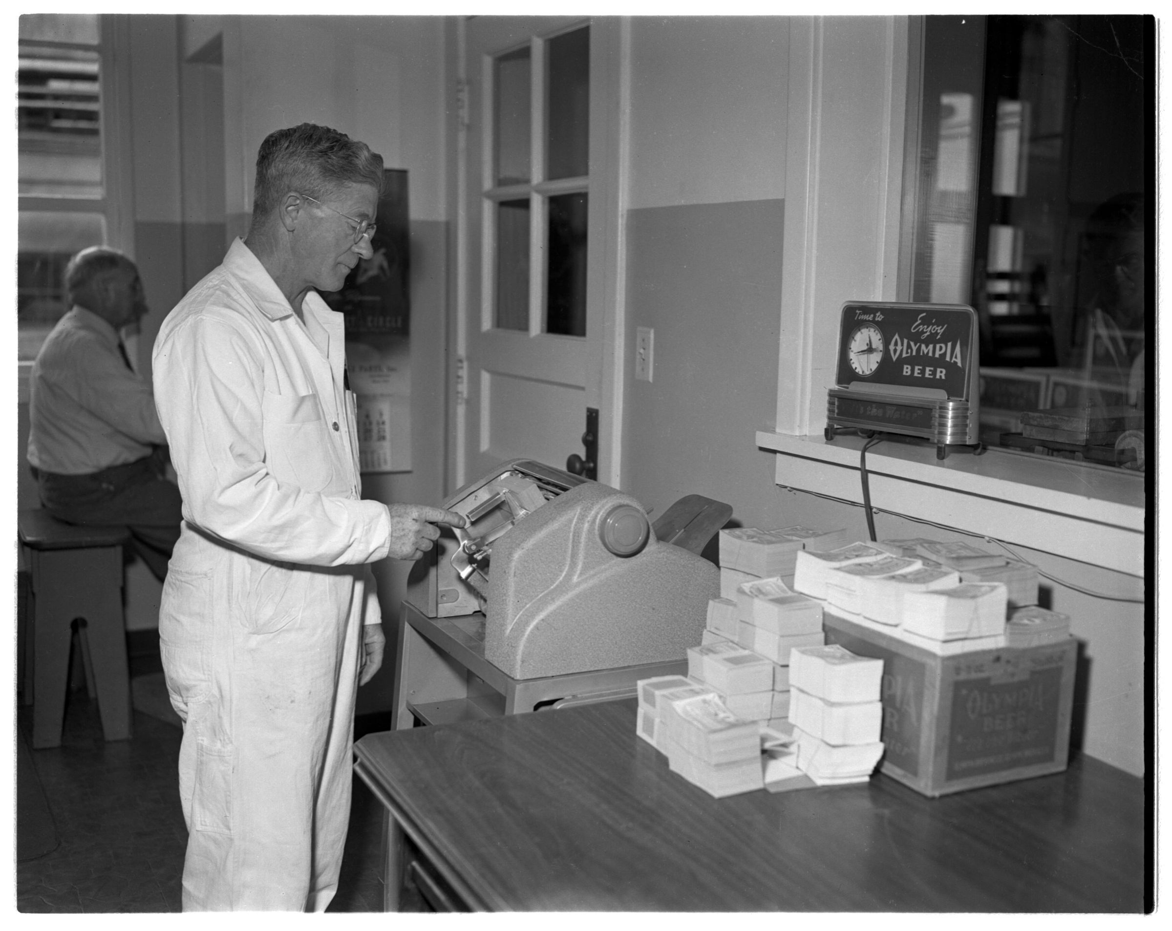 Negative, sheet film. 4 x 5 b&w. Brewery employee working with possibly tax stamps.