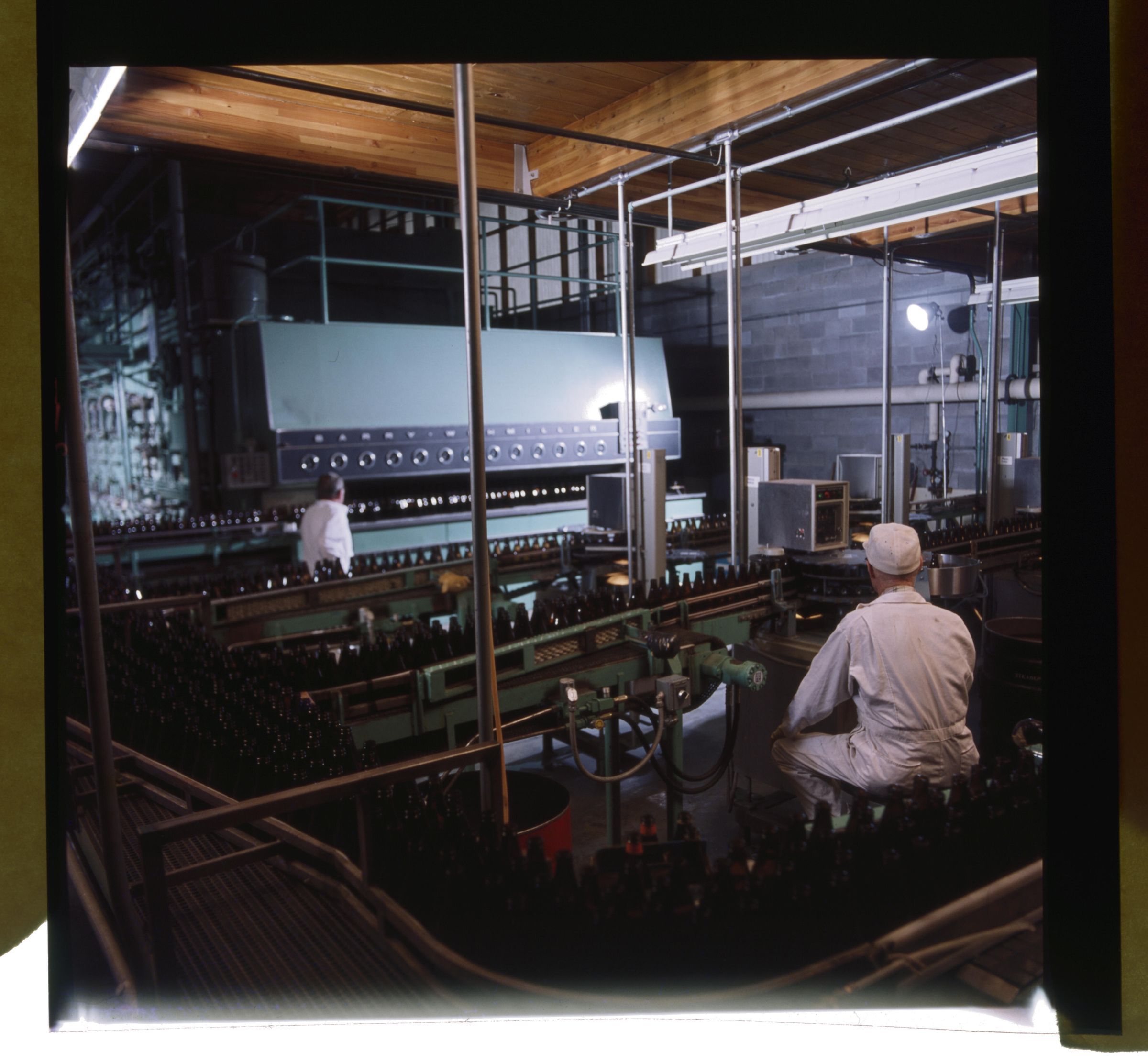 Negative, sheet film. 2 x 2 postive. Bottle washer at Oly brewery.
