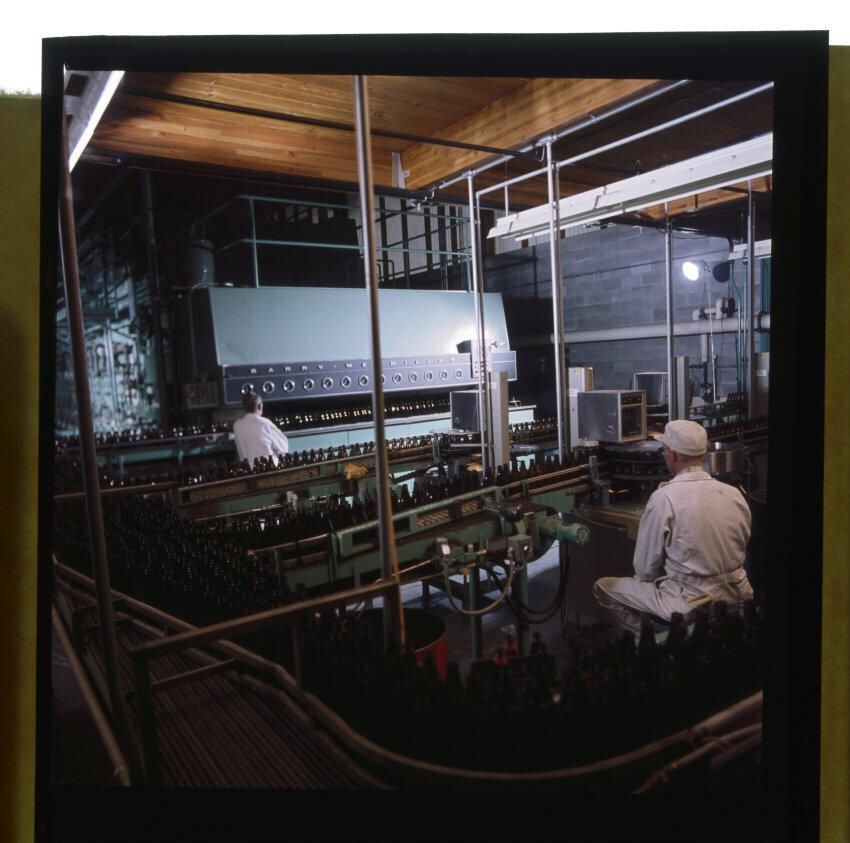 Negative, sheet film. 2 x 2 postive. Bottle washer at Oly brewery.