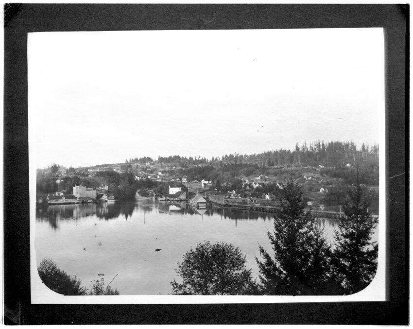 Negative, sheet film. 4 x 5 b&w. View looking southwest of old Olympia Brewing Company, at foot of falls. Original wooden brewhouse at left. Large white building in center is Crosby's Lincoln Flour Mill.Name/Title