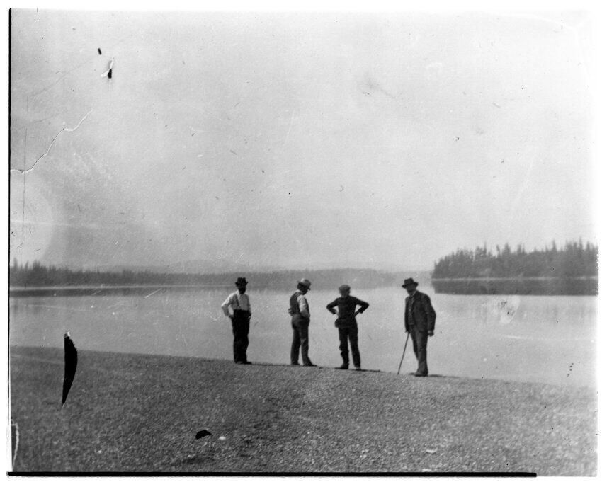 Negative, sheet film. 4 x 5 b&w. Group of men on saltwater beach, probably on south Puget Sound. No ID on men.