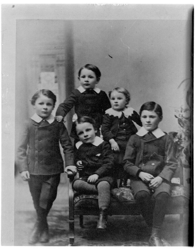 Negative, sheet film. 5 x 4 b&w. Five sons of Leopold and Johanna Schmidt. Photo probably taken in Montana (Deer Lodge?). Left to right: Peter G., Adolph (standing), Leo Jr. (on bench), Frederick (on back of bench), Frank.Name/Title
