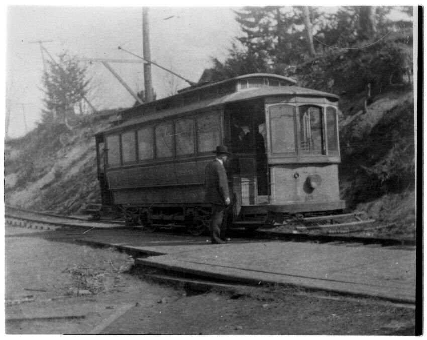 Negative, sheet film. 4 x 5 b&w. Olympia Light and Power electric trolley car that ran between Olympia and Tumwater.
