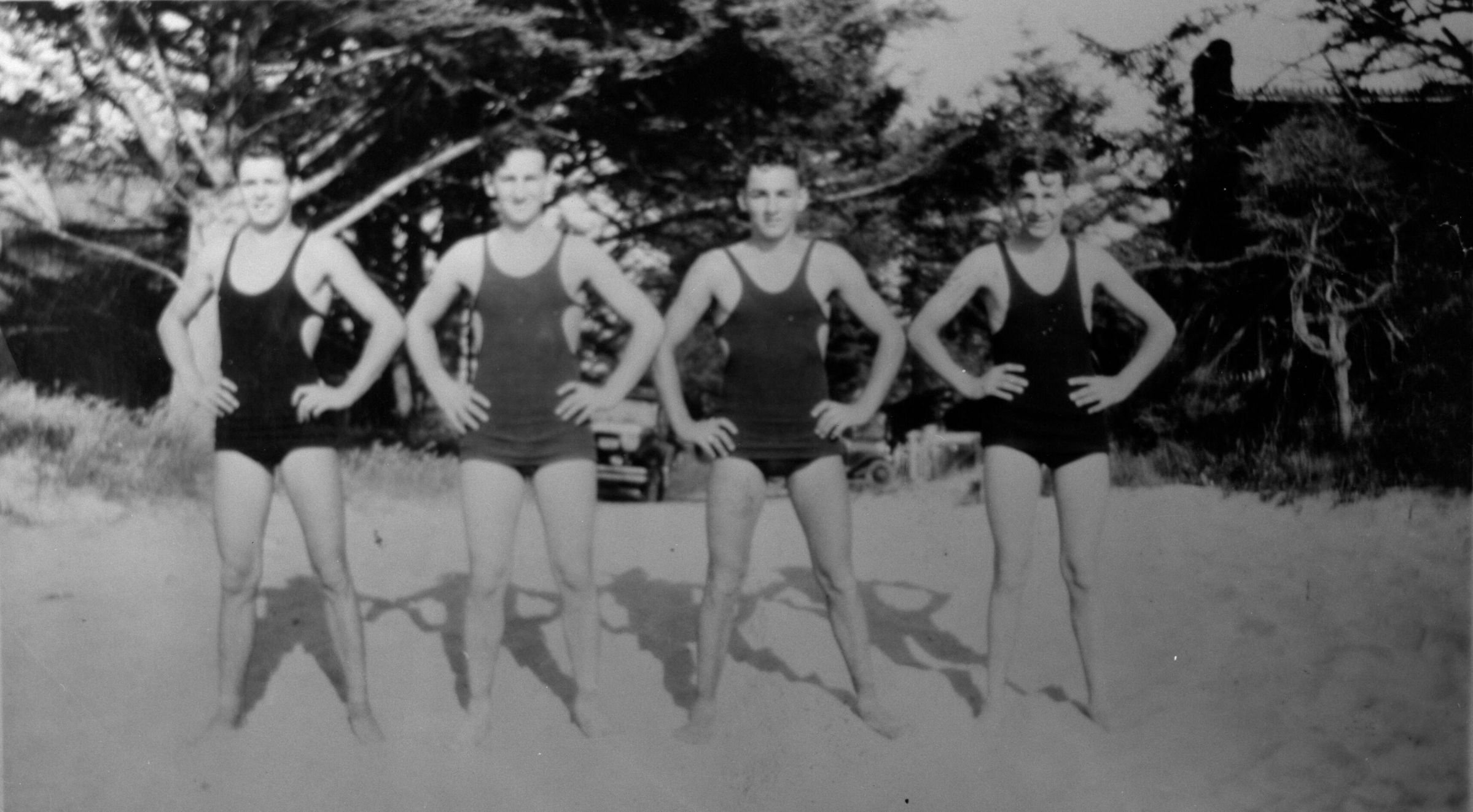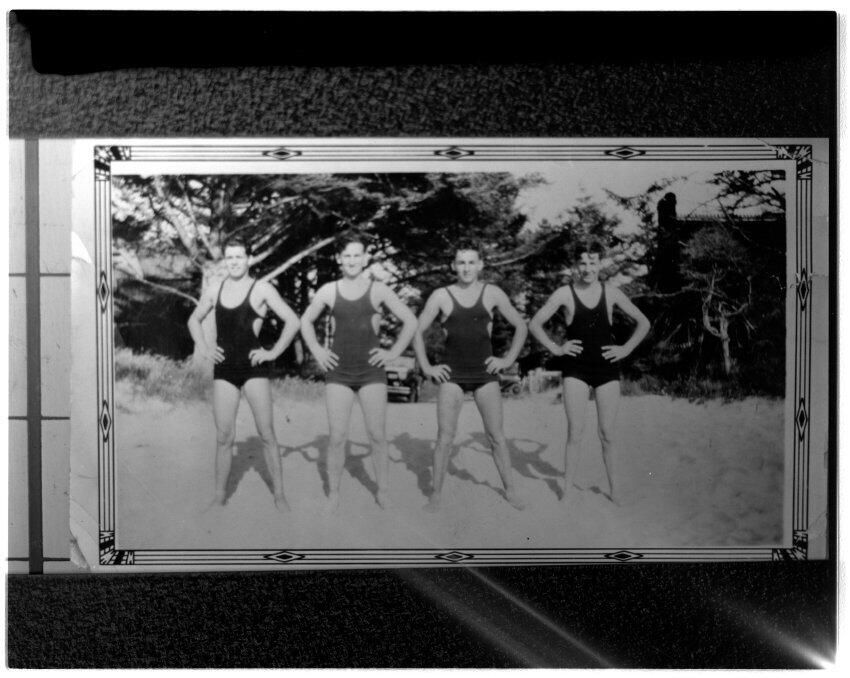 Negative, sheet film. 4 x 5 b&w. Four unidentified young men in bathing suits. 2nd from right may be Bink or Bump Schmidt. Unknown location.