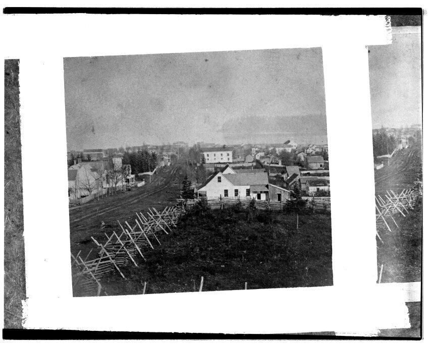 Negative, sheet film. 4 x 5 b&w. Photo taken from Main St (now Capitol Way) looking north through Olympia.