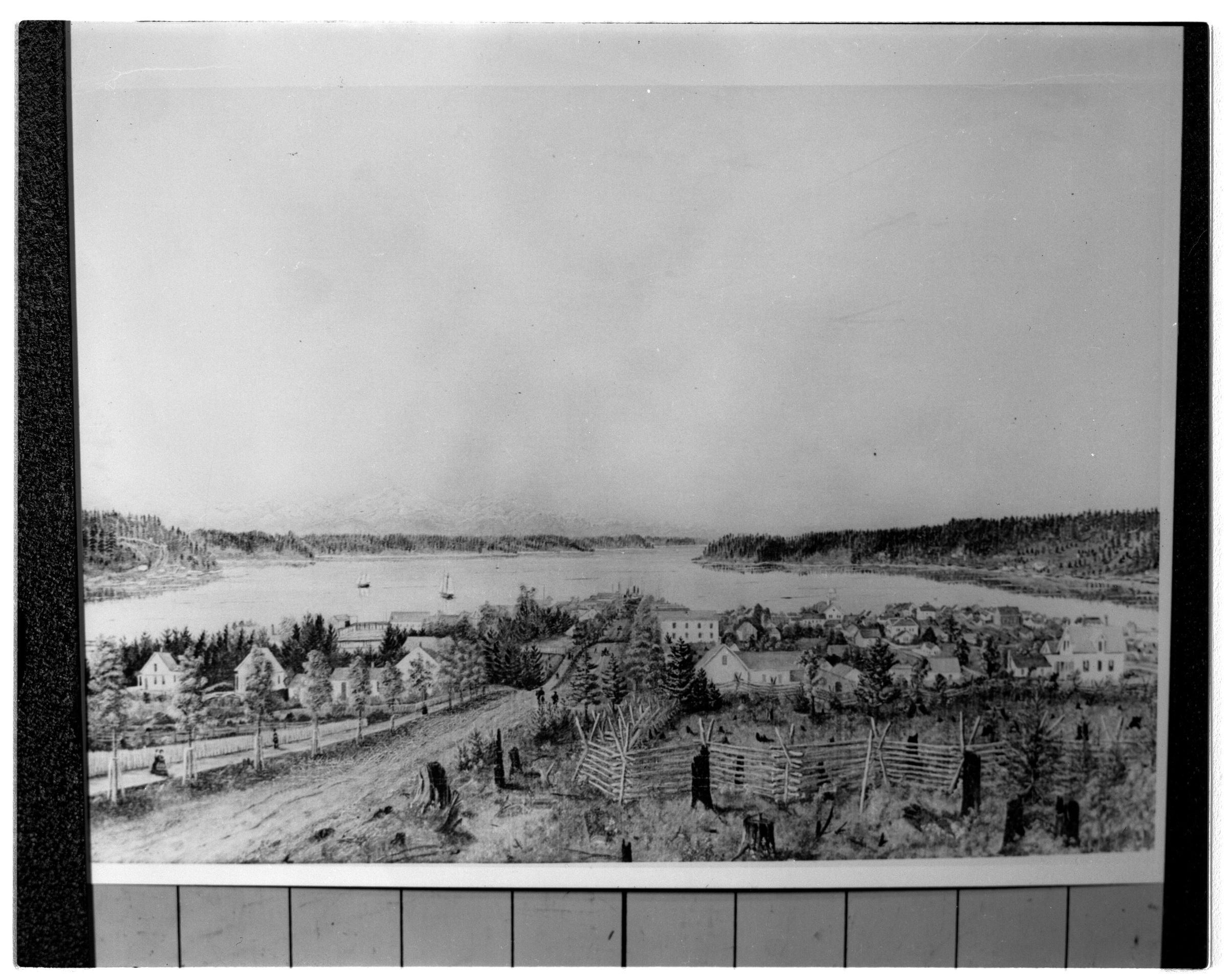 Negative, sheet film. 4 x 5 b&w. Drawing of early Olympia (1860-1875), looking north down Main St (now Capitol Way) to water in distance.
