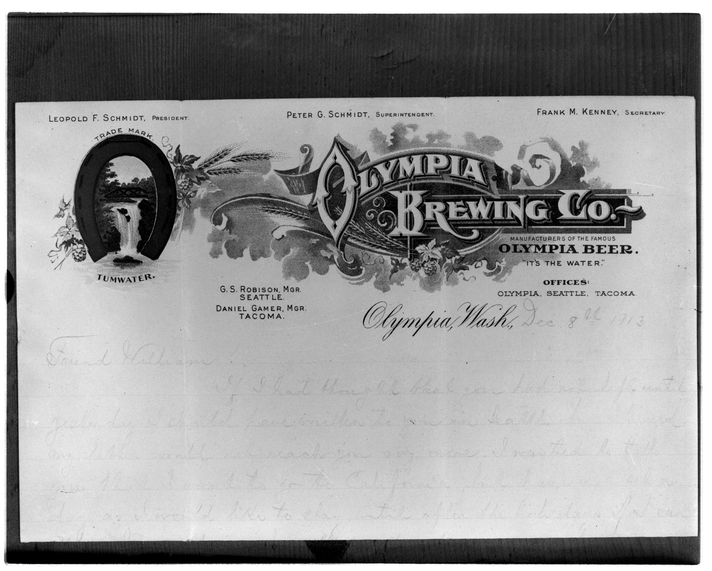 Negative, sheet film. 4 x 5 b&w. Olympia Brewing Company letterhead, letter dated 1913.