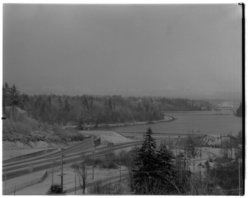 Negative, sheet film. 4 x 5 b&w. Olympic Mountains from M Cellar of Olympia brewery. Snow.